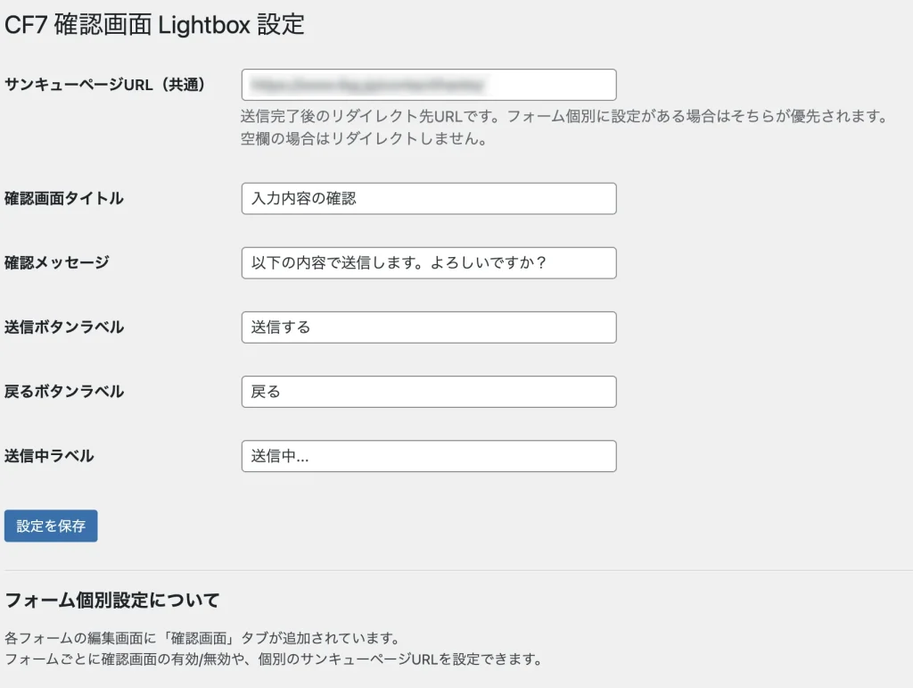- フォーム個別設定 — 各CF7フォームの編集画面に「確認画面」タブが追加され、フォームごとに有効/無効の切り替えや個別サンキューURLを設定できます