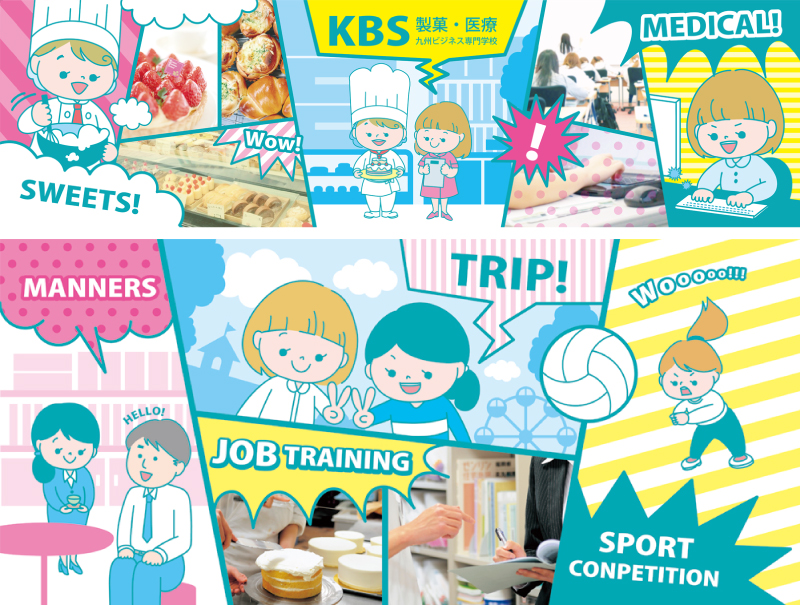 北九州市にある製菓・医療 九州ビジネス専門学校様の壁面広告イラストを制作させていただきました。