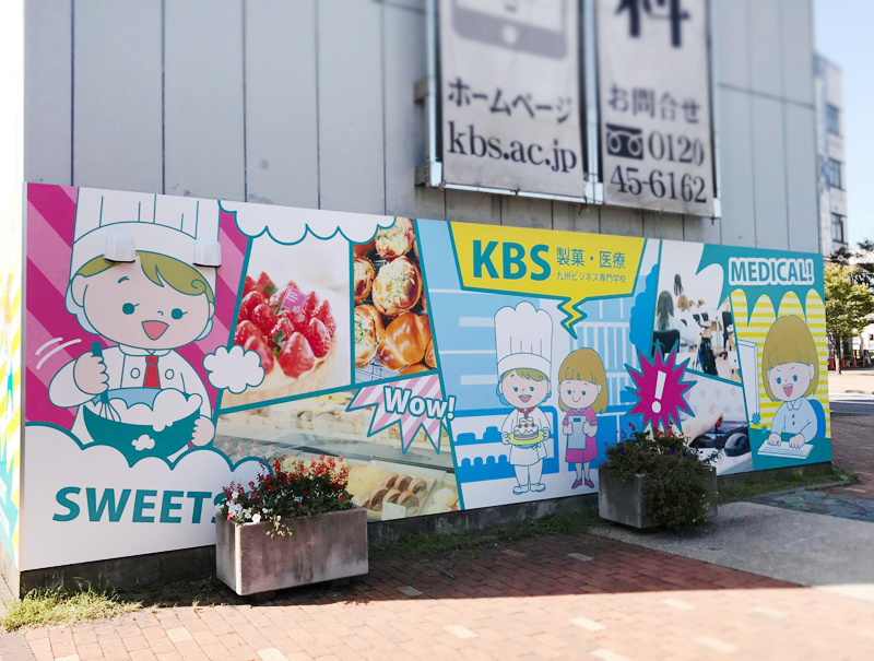 北九州市にある製菓・医療 九州ビジネス専門学校様の壁面広告イラストを制作させていただきました。